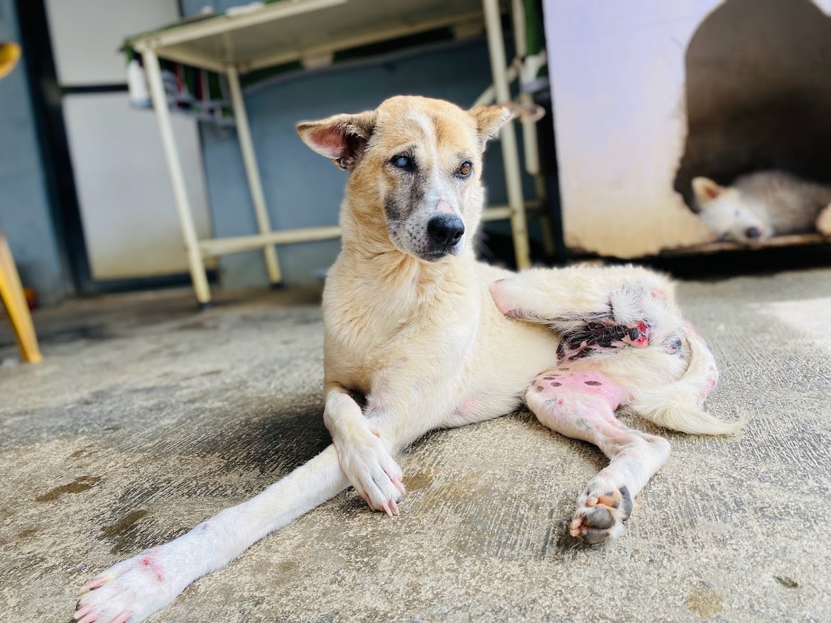During the start of the pandemic, I left my territory in search of food and water. Times were tough for all of us, and I was trying to survive. But the world was harsh, so I went to new areas to find food but I ended up getting chased by other dogs in the area, I was horribly injured, a huge gaping wound even exposed my throat. The pain was unbearable, but it didn’t end there, my disorientation led me to be hit by a vehicle. My leg was crushed, adding even more suffering.