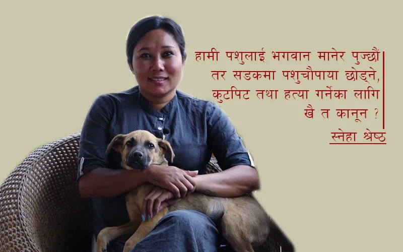 काठमाडौं । सबैको जीवनमा कुनै न कुनै टर्निङ प्वाइन्ट आउँछ जसले उसको सोच, उद्देश्य, चाहना सबै कुरा बदलिदिन्छ । जोगीलाई राजा बनाउँछ अनि राजालाई जोगी । स्नेहाको जीवनमा पनि त्यस्तै टर्निङ प्वाइन्ट आयो जसले पार्टी गर्ने, माछामासुविना खानै नबस्ने, जनावरलाई त्यति वास्ता नगर्ने, जिद्दी अनि ‘गो विद दि फ्लो’ भन्ने हठी स्नेहाबाट पशुप्रेमी, भेगन, सानोसानो कुरामा रमाउने, प्रकृतिप्रेमी बनाइदियो । यहाँसम्मकी केही उद्देश्य नै नभएको स्नेहाको जीवनमा एउटा ‘पर्पोज’ ल्याइदियो । त्यही पर्पोजलाई पूरा गर्ने क्रममा अहिले स्नेहा एनिमल एक्टिभिस्ट भएकी छिन् । ‘स्नेहाज् केयर’ नामक संस्था स्थापना गरेर सबैले बेवास्ता गरेका, अलपत्र सडकमा छोडिएका, घाइते, बेवारिसे कुकुरहरुलाई ‘माया र केयर’ दिन्छिन् ।